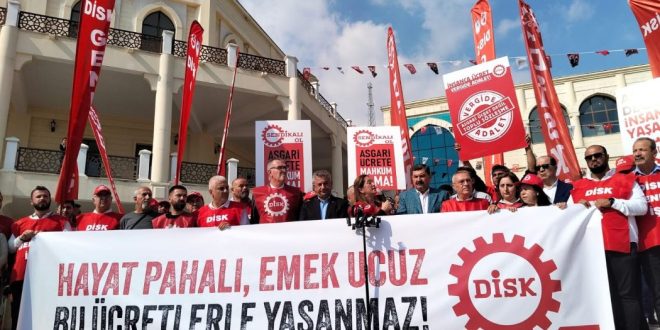 DİSK Başkanı Arzu Çerkezoğlu, Türkiye’de işçilerin yılın ilk 9 ayında vergiler ve kesintiler nedeniyle 1 trilyon 328 milyar TL kaybettiğini söyledi. Çerkezoğlu, “Ücretlerimiz, alım gücümüz hayat pahalılığı karşısında her gün eriyor. Yılın başında 22 bin 104 lira olarak açıklanan asgari ücret 9 ayda 5 bin 621 lira kaybetti. Bugün asgari ücret 16 bin liralara geriledi. Yılın başında yüzde 30 olarak belirlenen asgari ücret resmi enflasyon karşısında bile 15 puan alacaklı başladı bu yıla. Şimdi hedeflenen enflasyon diyorlar. Bugün Türkiye’de milyonlar asgari ücretle açlığa mahkûm edilmek isteniyor” dedi. Çerkezoğlu, asgari ücretin tüm konfederasyonların söz sahibi olduğu bir toplu pazarlık süreciyle belirlenmesi çağrısında bulundu.