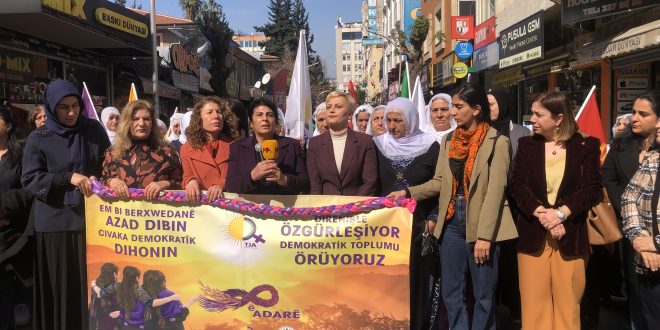 Mersin’de TJA ve DEM Parti Kadın Meclisi, 8 Mart takvimine dair yaptığı açıklamada kalıcı bir barışın ve gerçek bir demokrasinin kadın özgürlüğü güvence altına alınmadan sağlanamayacağının vurgusunu yaptı.