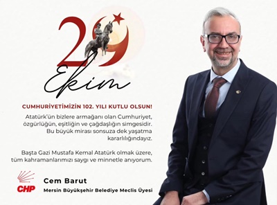 CHP Mersin Büyükşehir Belediye Meclis Üyesi Cem Barut, Cunhuriyetin Kuruluşunun 102. Yıldönümü dolayısıyla bir kutlama mesajı yayınladı.
