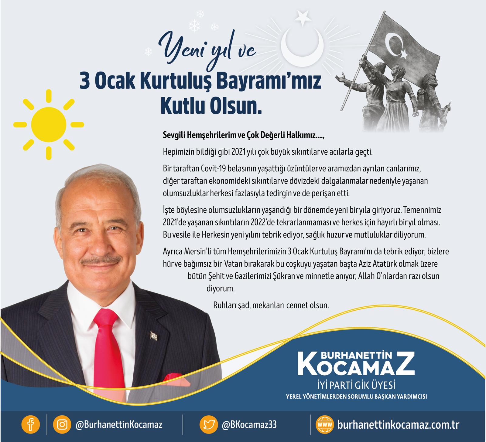 İYİ Parti GİK üyesi ve İYİ Parti Yerel Yönetimlerden Sorumlu Genel Başkan Yardımcısı Burhanettin Kocamaz, yeni yıl ile 3 Ocak Mersin’in kurtuluşunu kutladı.