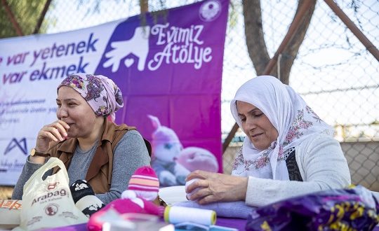 Kadınlar, ‘Elde Var Yetenek, Evde Var Ekmek’ sloganıyla hayata geçirilen ve kadınlara meslek öğretip, kendi evlerinde üretim yapmalarını ve ev ekonomilerine katkı sağlayan projeden duydukları mutluluğu ifade ediyor. ‘Çoraptan Oyuncak’ atölyesine katılan kadınlar, el becerilerini geliştirmenin yanı sıra, sosyalleşme fırsatı da buluyor. Atölye kapsamında anneleri dikiş dikerken, minikler de öğretmenler eşliğinde eğitici oyunlar oynadı.