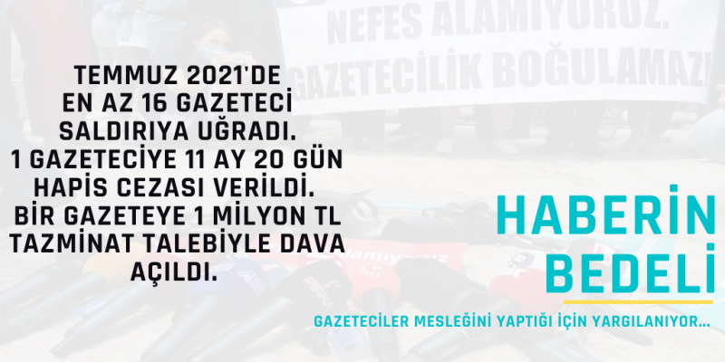 Aylık gazeteci yargılamalarına dair verilerin açıklandığı “Haberin Bedeli” Temmuz 2021 raporu, açıklandı. Rapora göre; gazeteciler bir yandan yaptıkları haberler yargı karşısına çıkarken, bir yandan da haber takipleri sırasında fiziki saldırılarla karşı karşıya kaldı.